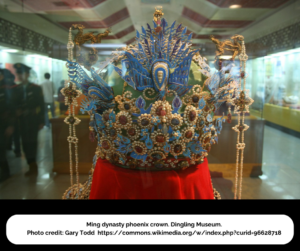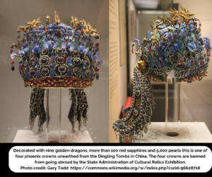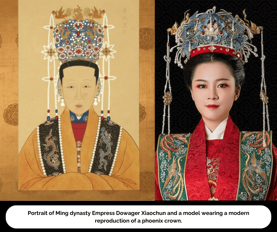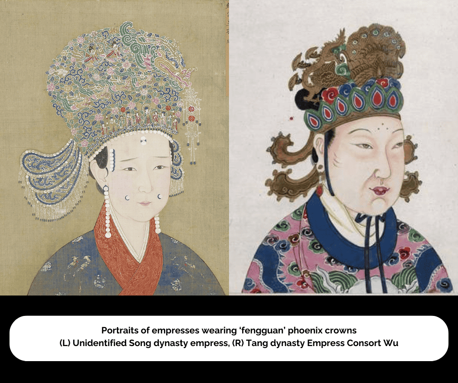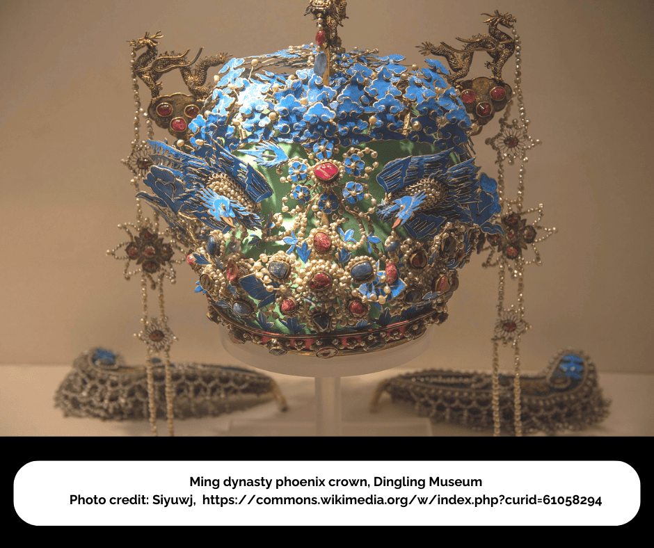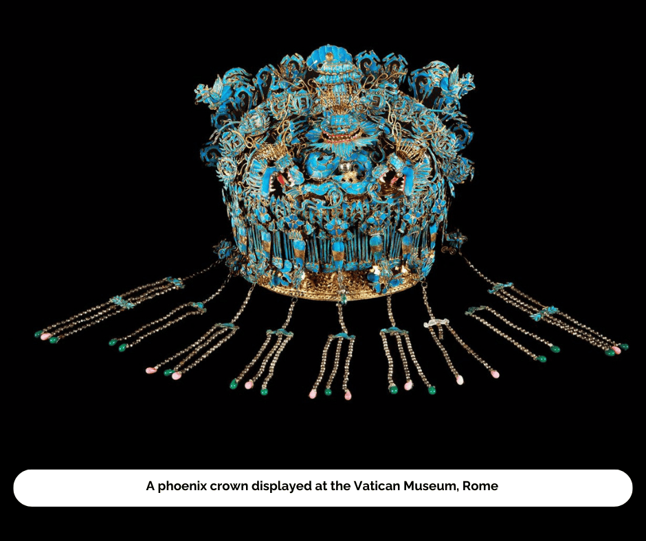 Known as 'fengguan' in Chinese, these were first crafted for China's empresses and later worn by wealthy brides of the aristocracy because they were 'empress for a day' on their wedding day. The key element was the use of blue kingfisher feathers. The blue in the feathers are an optical illusion due to the structure of the feathers and the colour never faces. Antique phoenix crowns are rare due to the fragility of the feathers.