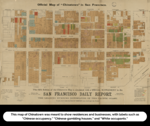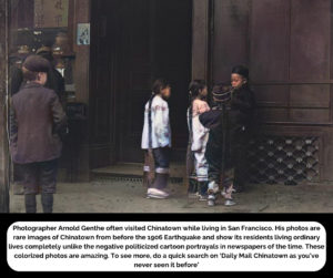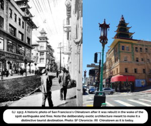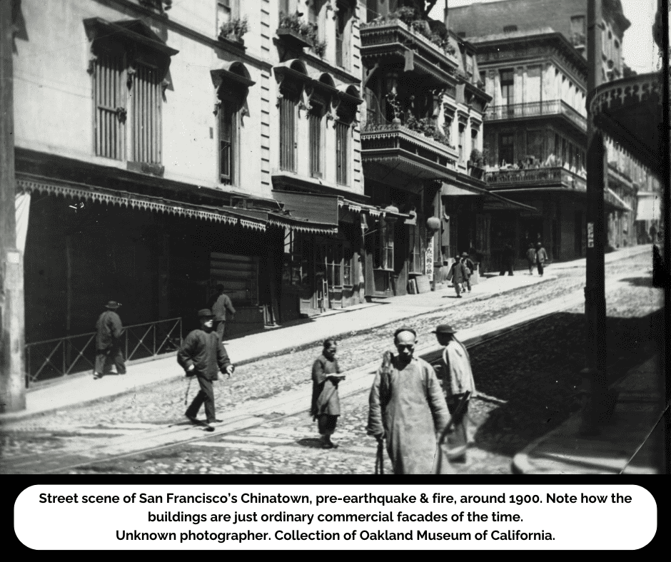 Chinatown burned to the ground in the fire that followed the earthquake, so there wasn't anything much left in the way of original buildings. Here are some historic photos of Chinatown. The Chinatown you see today was built after the earthquake. Chinatown's business leaders decided they needed to fight racism by remaking it into a tourist and commercial district. Thus was born the pseudo-Chinese architecture that's been imitated in Chinatowns all over the world and later, the highly commercialized Chinese New Year's Dragon Dance parade.